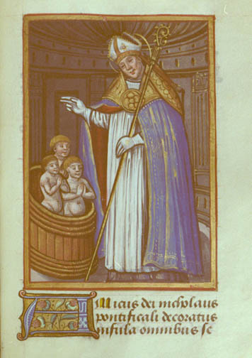 A história do santo bispo, que numa noite de Natal lançou pela janela os dotes a três moças pobres, possibilitando assim seu casamento, está na origem da tradição dos presentes natalinos.