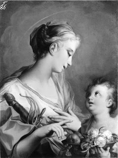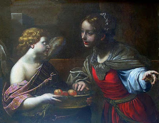 Enquanto estava rezando, apareceu-lhe um Anjo, em figura de um jovem formoso, que lhe ofereceu três maçãs belíssimas e outras tantas rosas de um aroma delicioso.